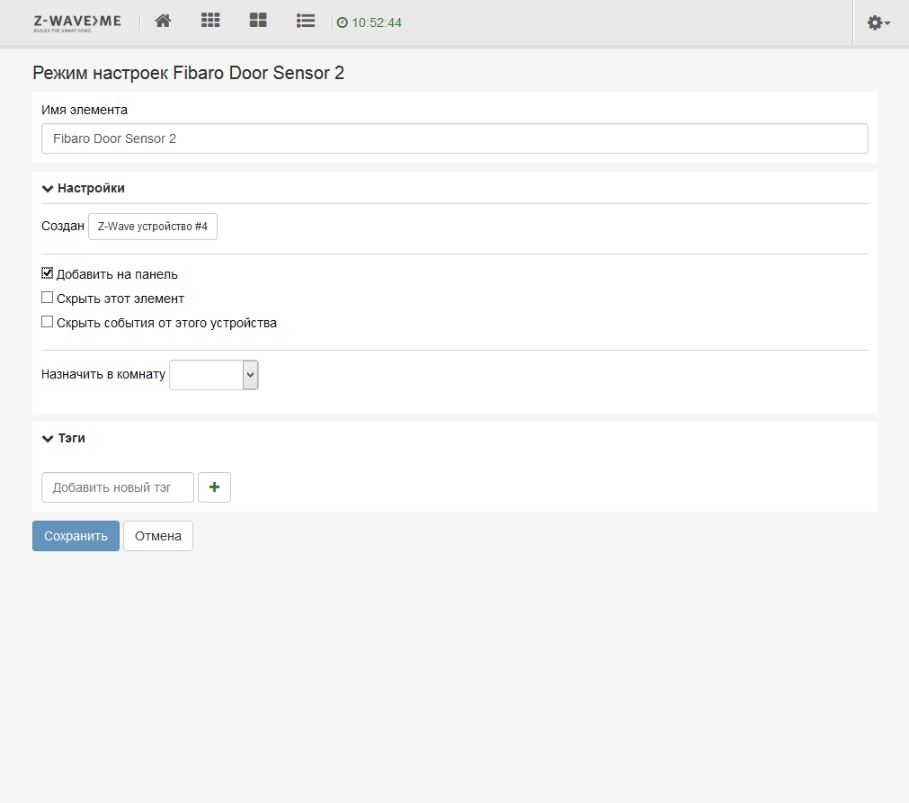 В свойствах вы можете записать собственное название, вывести его значок на основной экран, назначить комнату и тэги, а также скрыть его в системе, если данный компонент не требуется в текущей конфигурации.