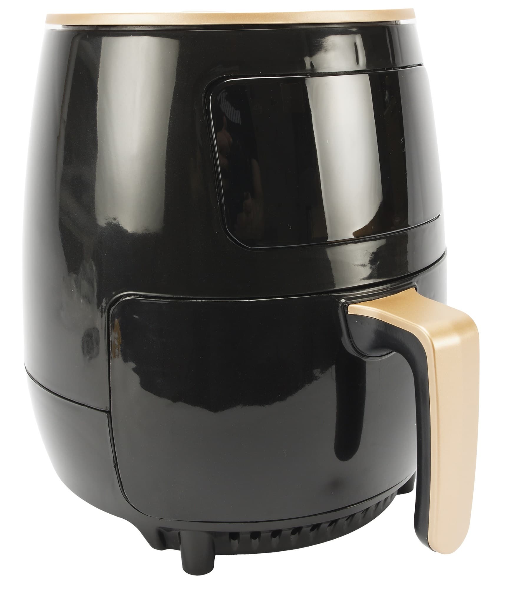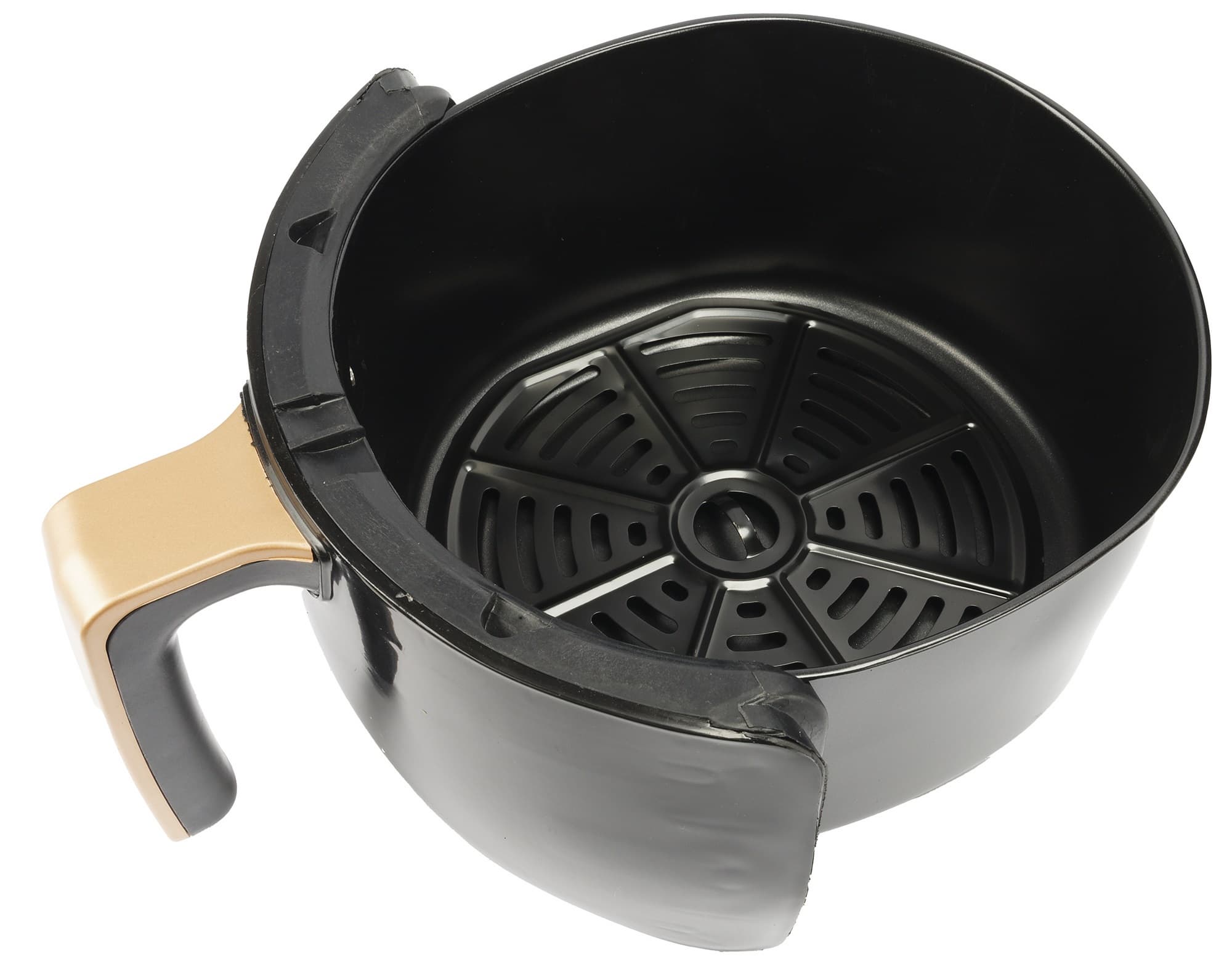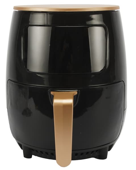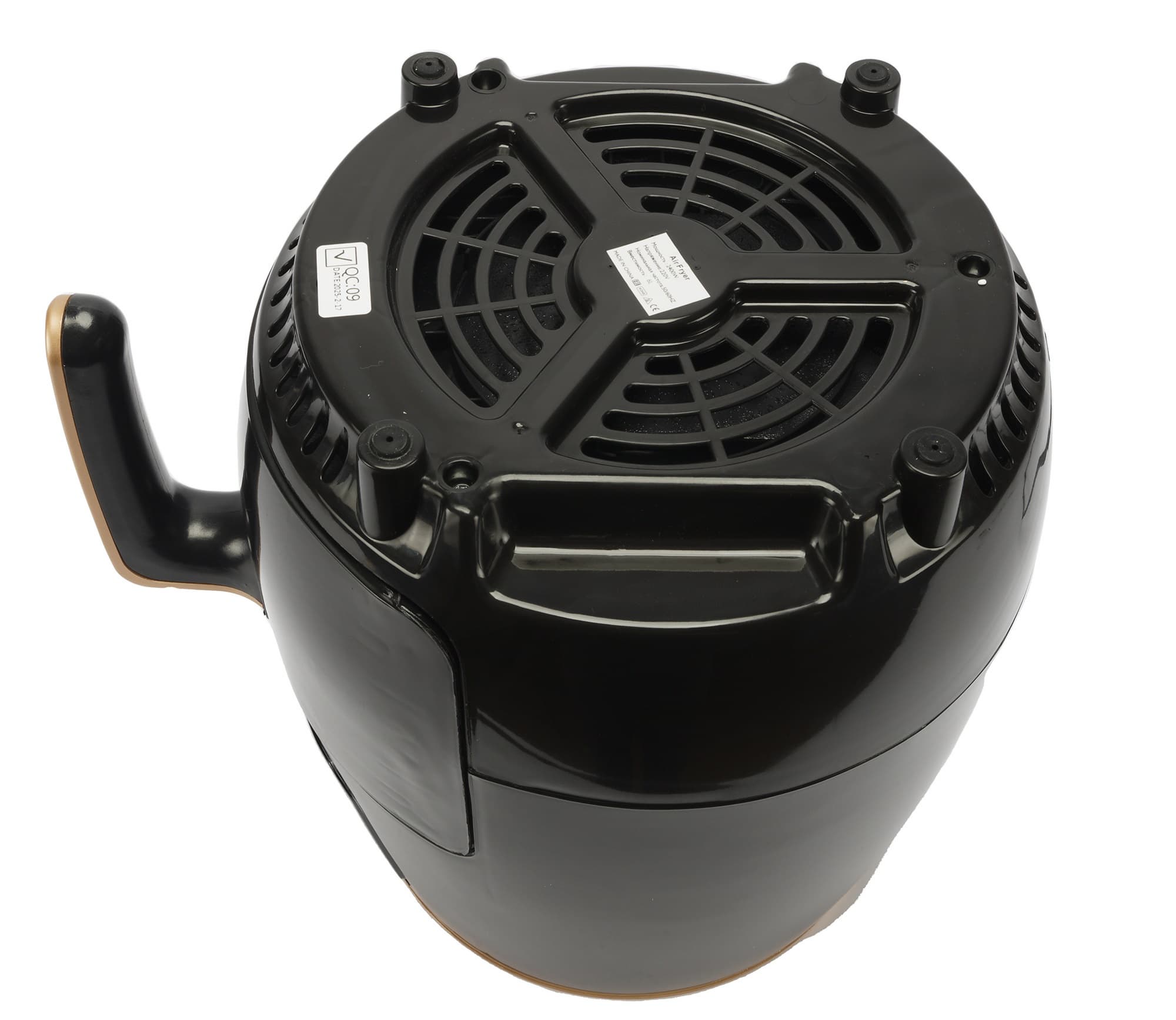 Форму аэрогриля можно было бы назвать усеченным овоидом, она напоминает яйцо со скошенной верхней более острой частью. Строгий лаконичный дизайн, черный пластиковый корпус с глянцевым покрытием дополнен крышкой матового золотистого пластика и ручкой с золотистым же покрытием. Глянцевое черное покрытие подчеркивает некоторые неровности поверхности корпуса, которые не слишком хорошо видны на фото, но тем не менее оставляют впечатление некоторой небрежности и ненадежности, вступая в противоречие со строгостью линий формы прибора.