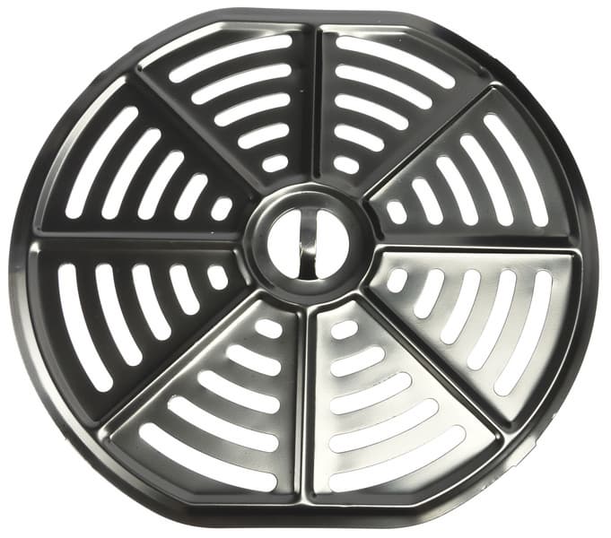 Внизу устанавливается съемная решетка. Она также выполнена из металла и на ней нанесено антипригарное покрытие, в середине имеется что-то вроде маленькой ручки-петельки из того же металла, что и сама решетка, за которую ее можно взять чтобы вынуть из чаши либо установить обратно. При установке решетки в чаше между поверхностью решетки и дном образуется некоторое пространство-резервуар высотой около 1 см.