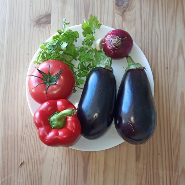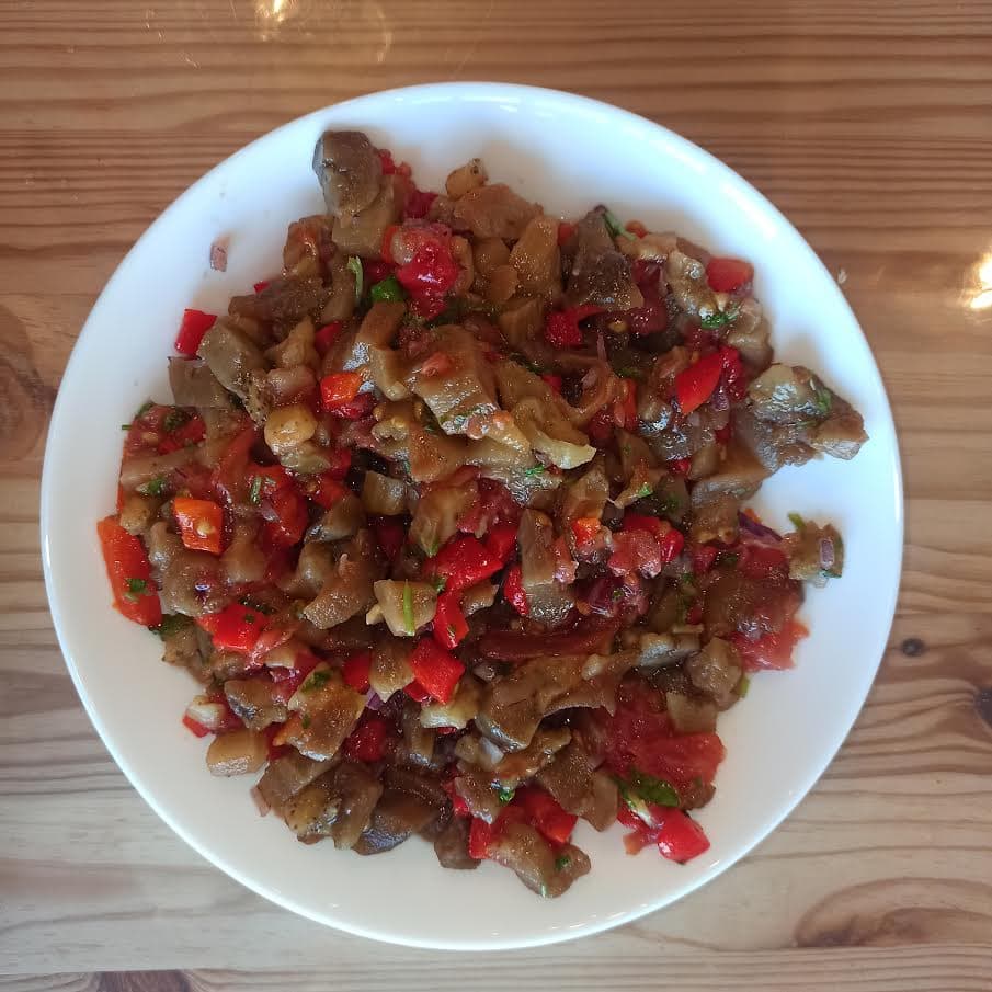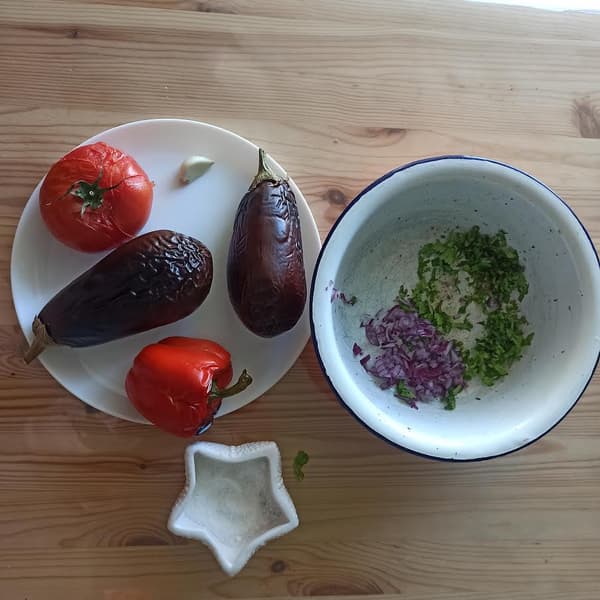 Шкурка с готового помидора снялась легко, баклажаны и перец мы разложили горячими по пластиковым пакетам, в которых они запотели, и дальше мы легко смогли снять шкурки и с них. Нарезав овощи небольшими кубиками, мы смешали их с мелко нарезанным красным луком, чесноком и кинзой, заправили оливковым маслом, подсолили и поперчили.