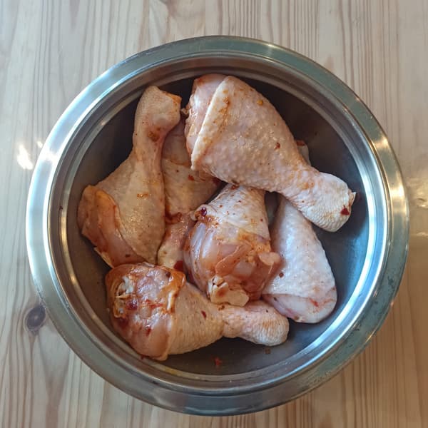 После экспериментов с овощами нам захотелось увидеть в деле следующий режим готовки — куриные ножки. Мы слегка замариновали их в оливковом масле с добавлением аджики, а затем поместили на решетку аэрогриля.
