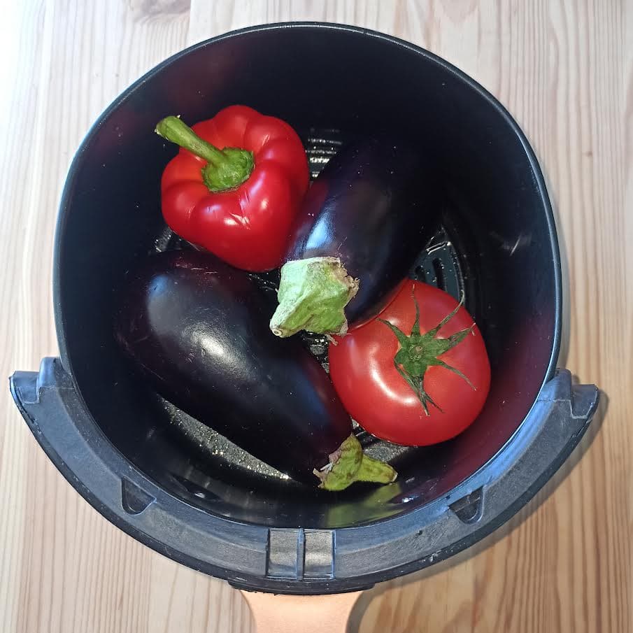 Болгарский перец, помидор и пара баклажанов были вымыты и помещены в чашу аэрогриля. Ориентируясь на свой предыдущий опыт приготовления этих продуктов в духовке, мы выставили температуру 180 °C и 40 минут (для этого подошли параметры предустановленной программы для картошки-фри).
