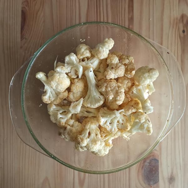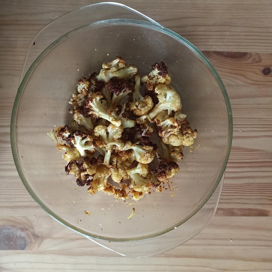 К следующему продукту мы пришли из желания эксперимента. Мы взяли вилок цветной капусты, разобрали его на соцветия, слегка побрызгали маслом, добавили соли и подходящих специй и выложили кусочки на решетку.
