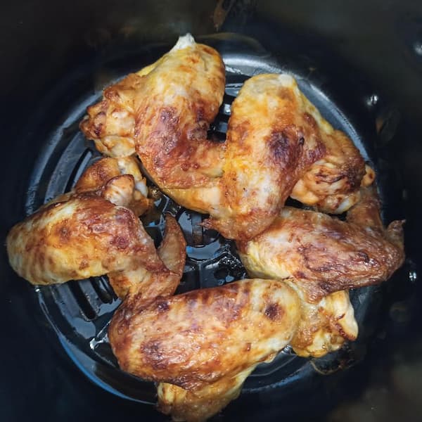 Было сразу понятно, что рекомендованные на крышке корпуса 20 минут при 200 °C будут недостаточны. Параметры предустановленного режима для курицы были более реалистичны: 35 минут при 200 °C. В процессе готовки мы время от времени открывали аэрогриль, смотрели за тем, что происходит, и переворачивали ножки. После визуального осмотра спустя положенное время захотелось немного продлить процесс готовки, и мы добавили еще минут 10-15.