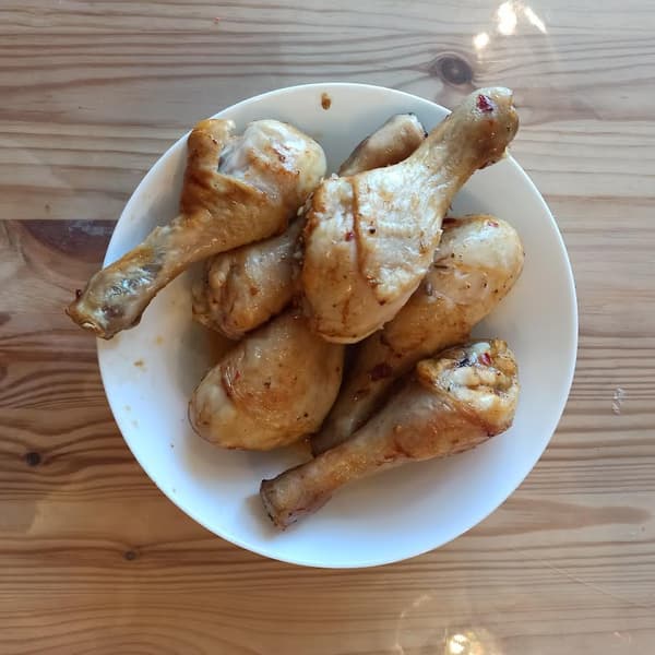 Результат был убедительный, ножки имели аппетитную, хоть и не слишком зажаристую корочку, приготовились и были вполне вкусны. Благодаря приготовлению в аэрогриле масла было минимум, они не были слишком жирные. Но нам показалось, что приготовление длилось несколько дольше ожидаемого и что под корочкой мясо на вкус было как будто не столько прожаренным, сколько сваренным.