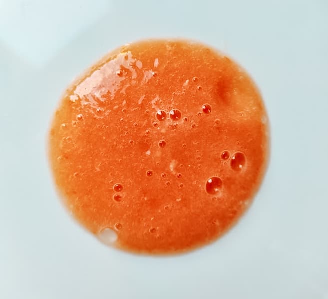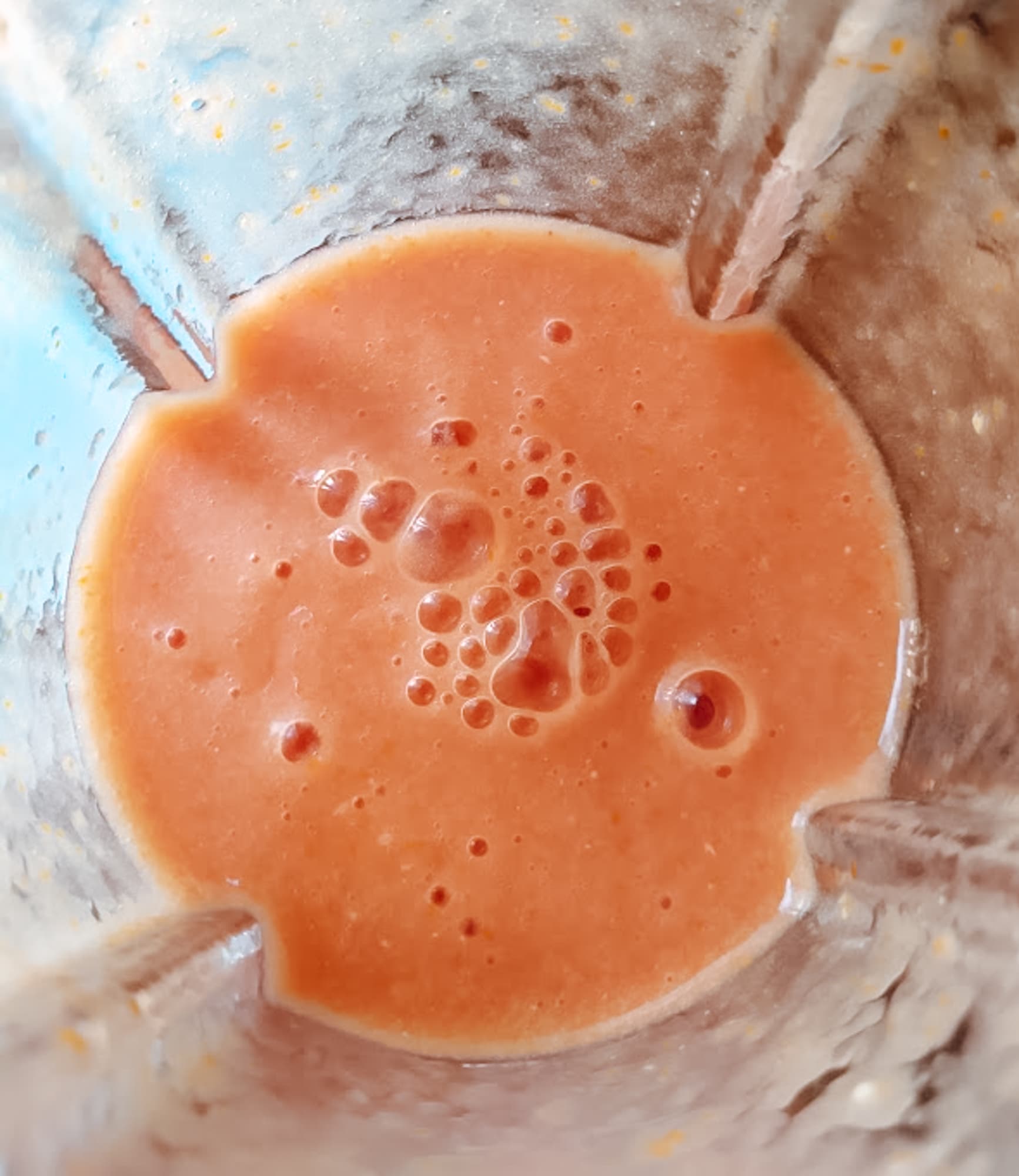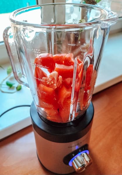 Уже через четыре секунды блендируемые на второй скорости томаты превратились в пюре. Мы подождали еще 8 секунд и выключили блендер. В чаше пузырилась розоватая масса.