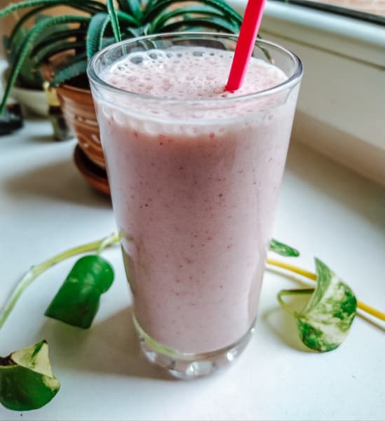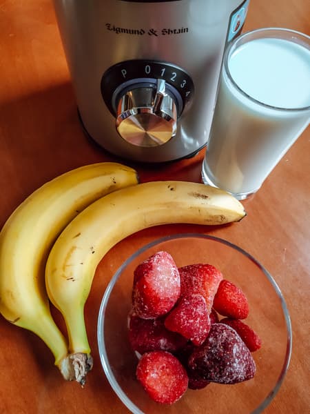 Этот освежающий и питательный напиток идеален для ленивого субботнего (и не только) утра. Мы взяли пару стаканов молока, два банана и немного замороженной клубники, которую ненадолго оставили на столе при комнатной температуре, так как инструкция запретила нам измельчать твердые замороженные продукты.