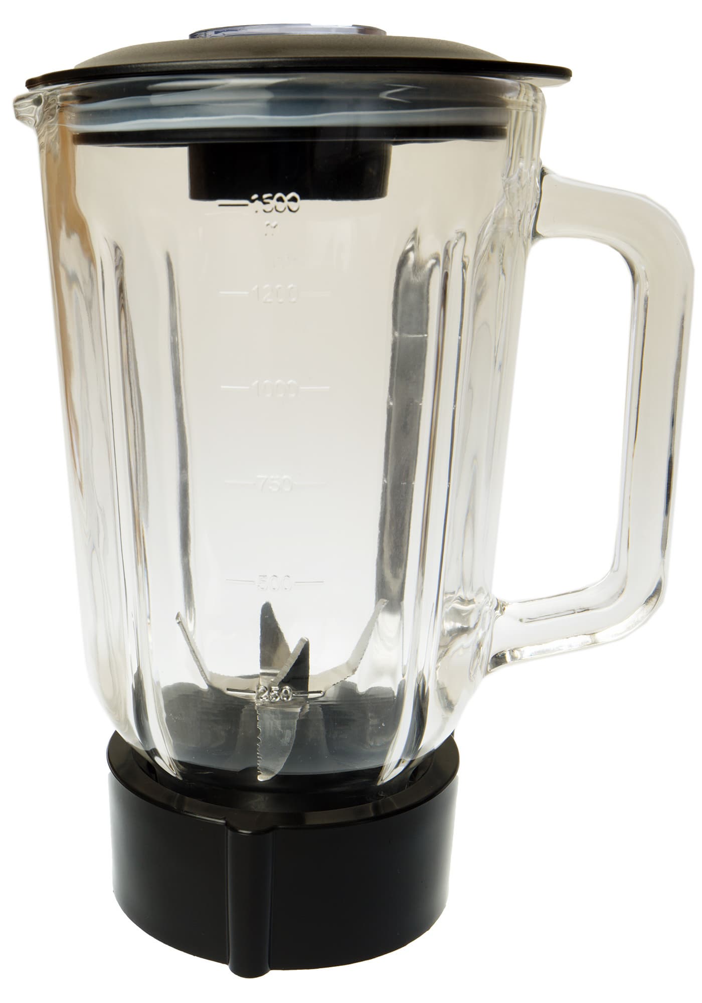 Стеклянная чаша имеет классическую форму кувшина. С двух сторон на нее нанесена разметка от 250 до 1500 мл с шагом 250 мл.