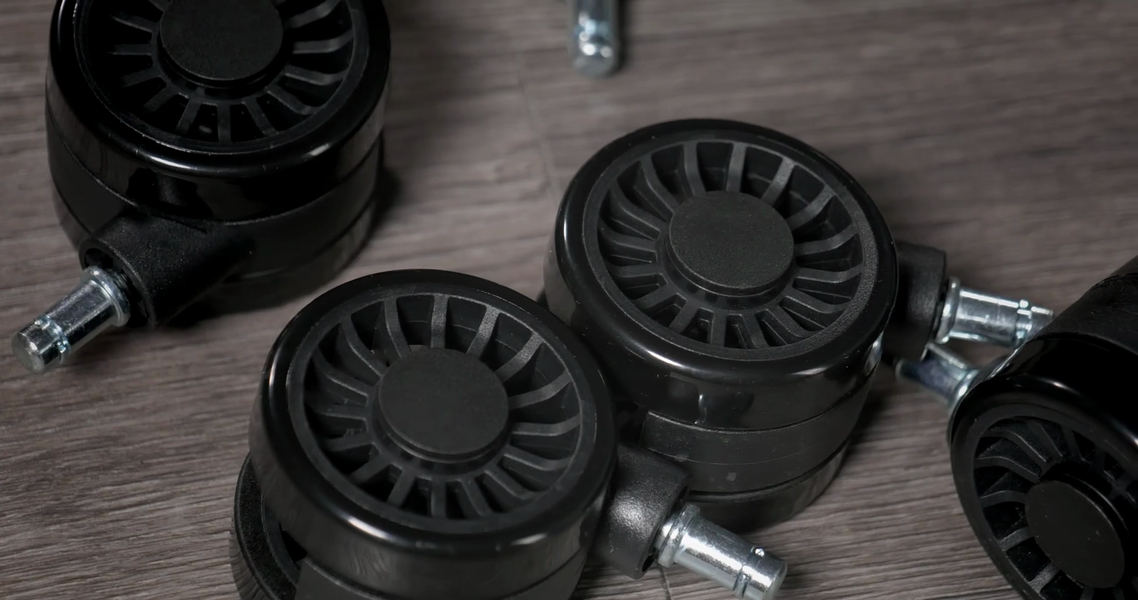 База здесь из стали. А вообще кресло весит 24 килограмма. Но ролики здесь мои любимые, двойные, 75 миллиметров в диаметре. И вот это сочетание тяжелого кресла и шустрых роликов — это здорово, потому что само оно никуда не уедет, а целенаправленно перекатить его просто.