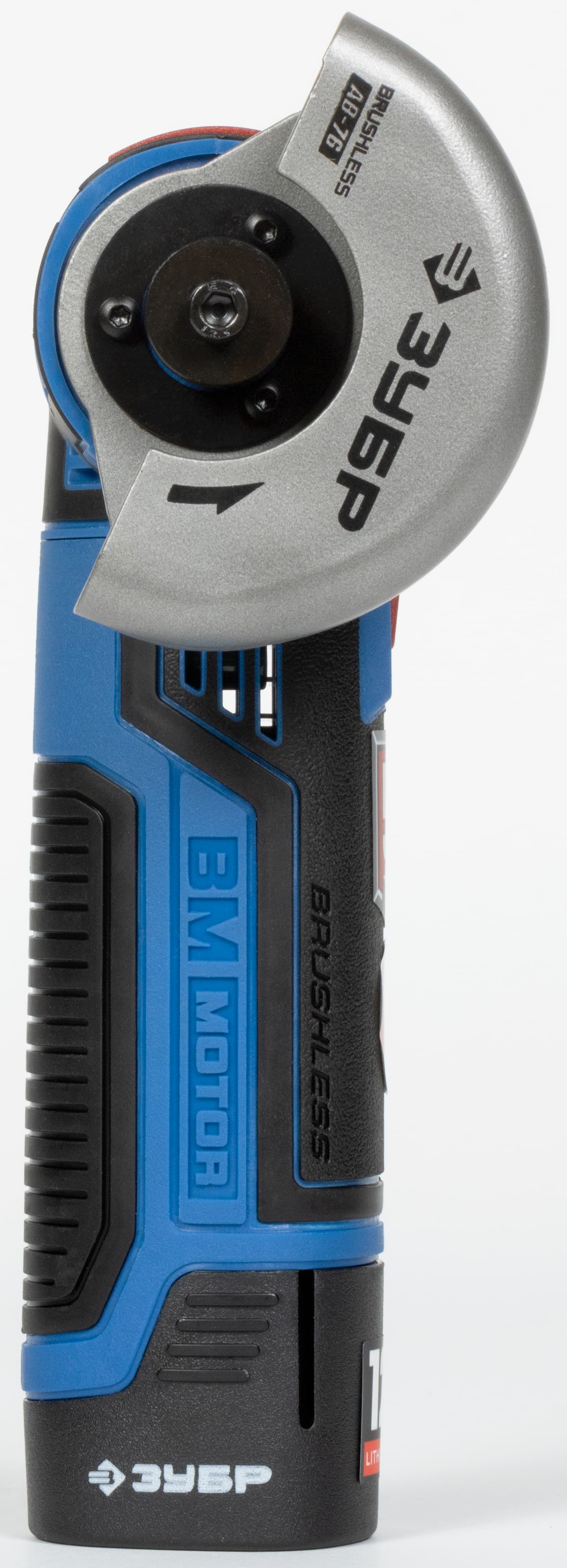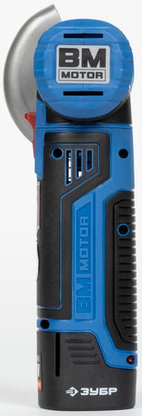 В рассматриваемой углошлифовальной машине работает бесщеточный двигатель. Управление производится обычным ползунковым переключателем с фиксатором. Переключатель находится на боку рукояти, под большим пальцем руки.
