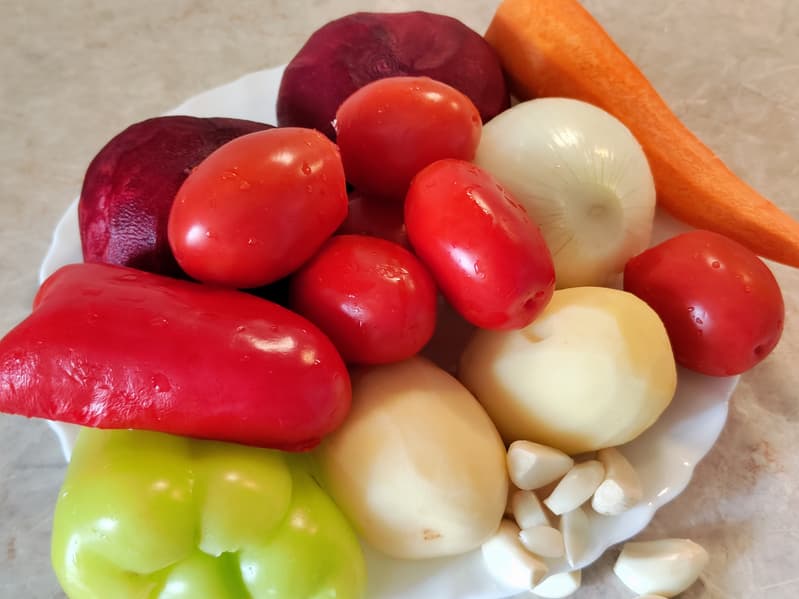 Нет, не замедлил. Перец покоричневел так же быстро. Добавили мелко нашинкованную свеклу, убавили нагрев до 800 Вт. В конце, когда свекла стала мягкой, высыпали морковь. Заправка, несмотря на сочность овощей, не превратилась в сотэ — продукты были отлично припущены, а не сварены. Добавили блендированные помидоры и потушили еще несколько минут.