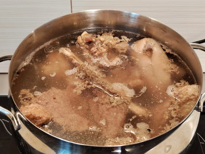 Бульон мы решили сварить из говяжьих костей и одной небольшой свиной голени. Взяли самую большую имеющуюся в наличии кастрюлю, заполнили ее водой и поставили на весы. Вес кастрюли с содержимым оказался равен 6,5 кг.