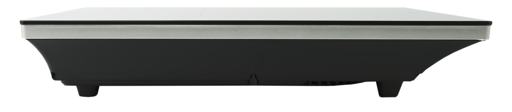 Высота плитки — 6,5 см. Боковая часть корпуса изготовлена из матового пластика черного цвета. Сантиметровая серебристая вставка визуально разделяет верхнюю рабочую и боковую часть корпуса. Ножки приподнимают плитку на 1,5 см над поверхностью стола.