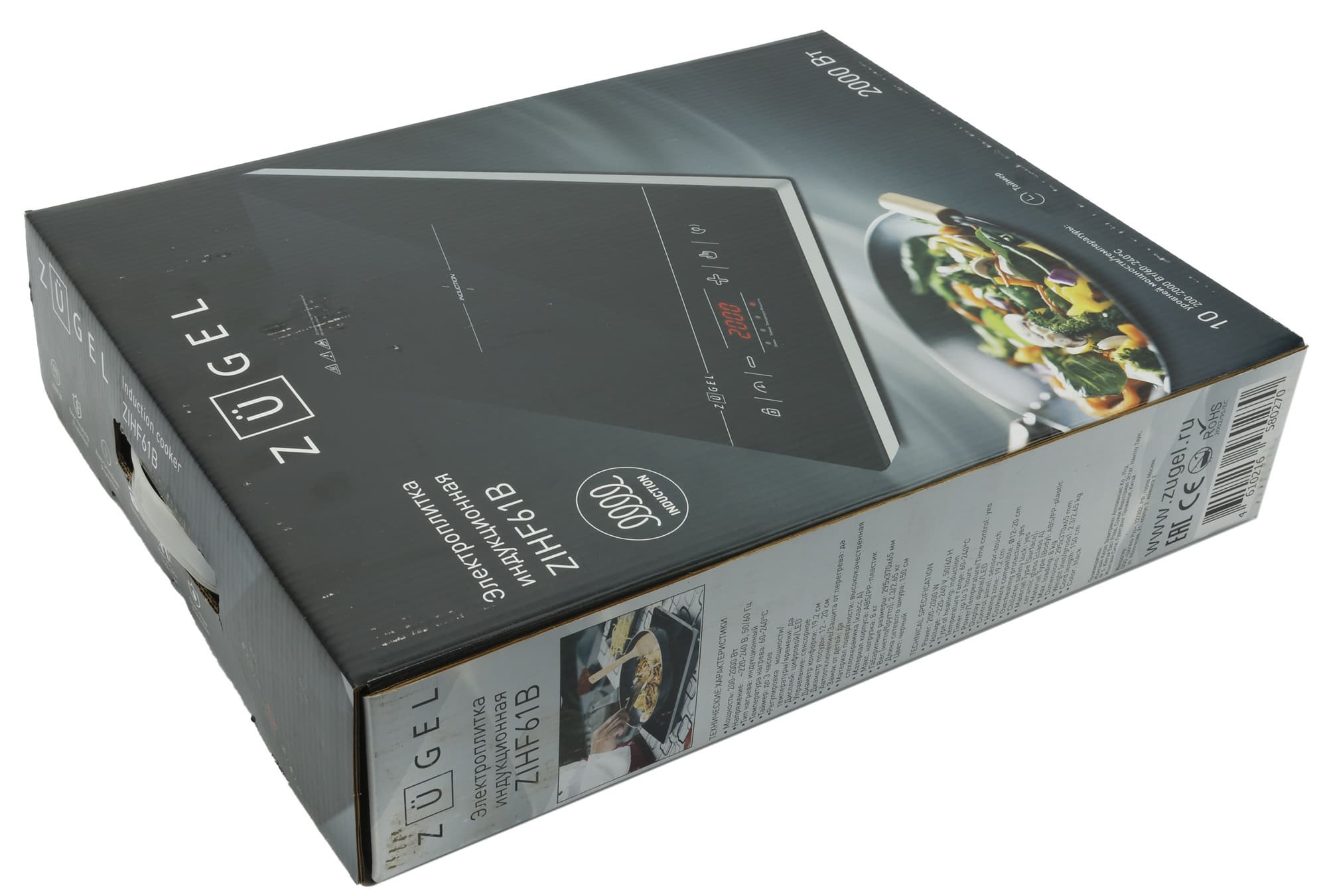 Индукционная электроплитка Zugel ZIHF61B — прибор компактный и, судя по заявленным техническим характеристикам, мощный. Одноконфорочная плитка предназначена для посуды с диаметром дна от 12 до 20 см, оснащена десятью режимами мощности, а также позволяет регулировать температуру приготовления от 60 до 240 °C.