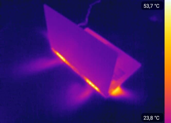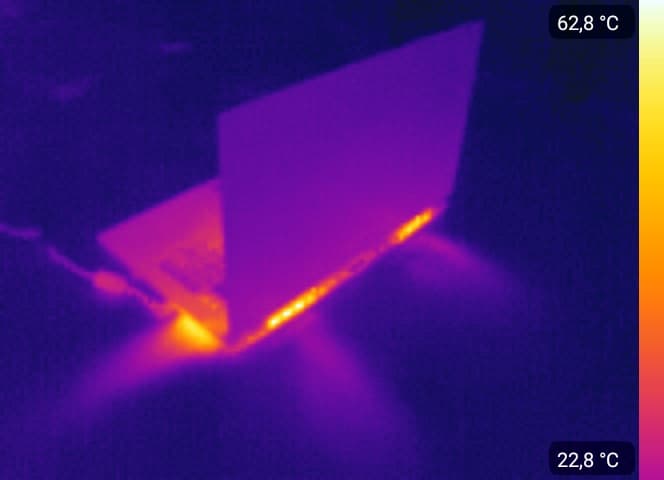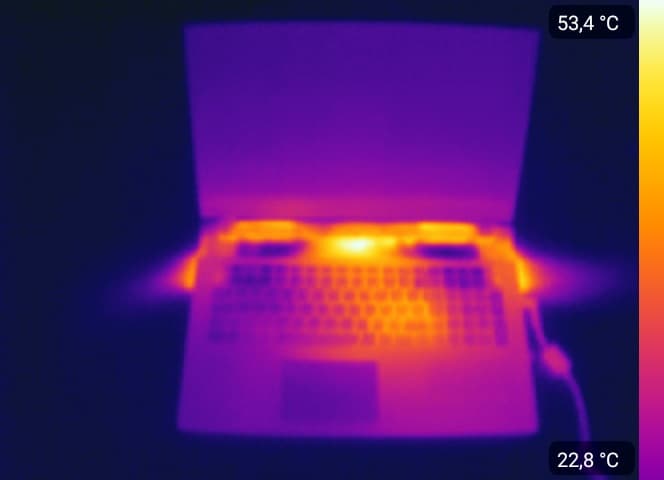 А теперь – обещанные фотографии, сделанные при помощи тепловизора. Конструкция корпуса выполнена таким образом, чтобы в рабочей зоне (сенсорная панель и клавиатура) дискомфорт от высоких температур не наблюдается. Конечно, корпус нагревается, однако никаких явных проблем в ходе продолжительного тестирования выявлено не было.