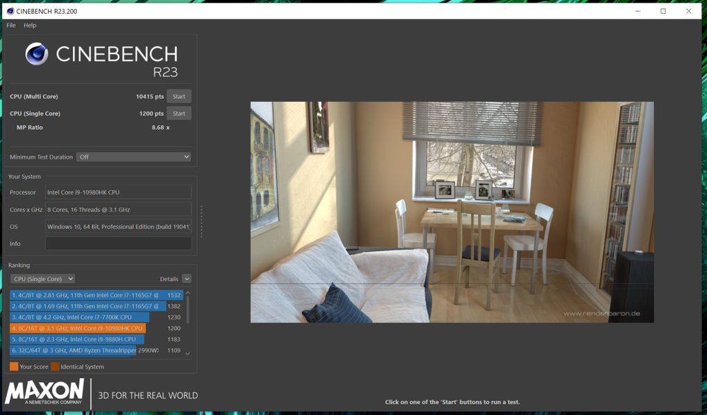 В бенчмарке Cinebench R23 процессор показал результат 10415 баллов при использовании всех ядер и 1200 баллов – в сценарии для одного ядра.