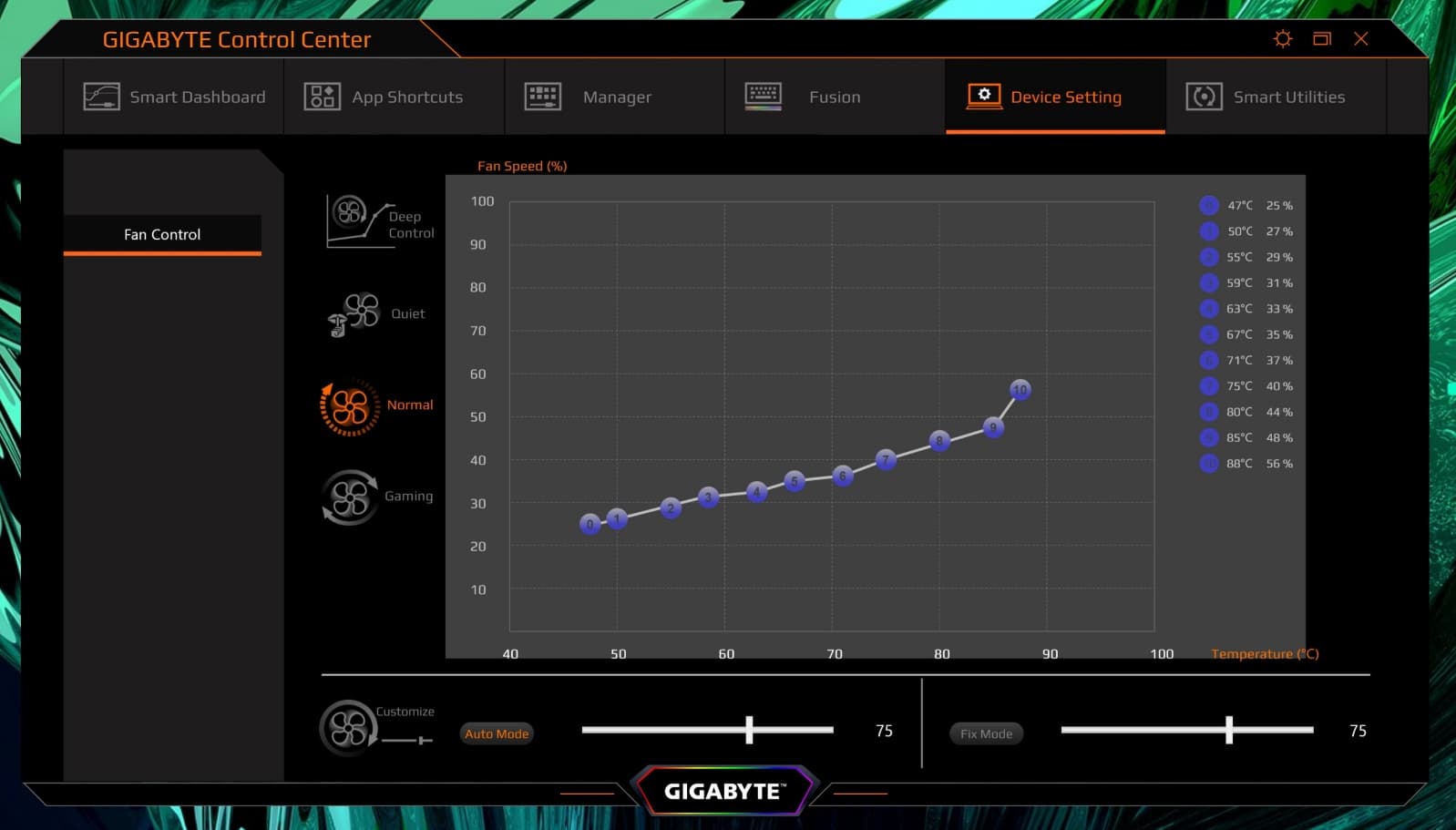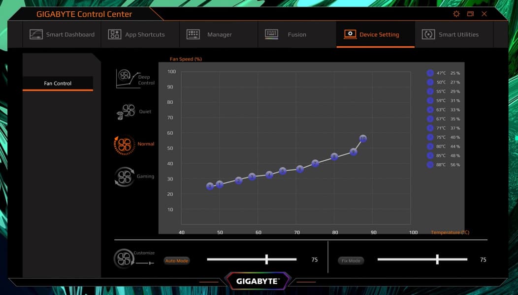 Встроенными средствами раздела Device Setting можно управлять скоростью вращения вентиляторов. Доступны несколько предустановленных профилей, также можно создать и активировать персональные профили на усмотрение пользователя.