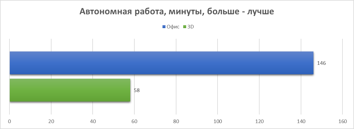 Что же касается автономной работы, то здесь всё сильно зависит от выбранного профиля работы и яркости дисплея. Если мы хотим наблюдать яркий экран и высокую производительность в 3D (игры), ноутбук способен продержаться около 1 часа, соответственно, в офисных приложениях (документы, таблицы, браузер) – немногим менее 2,5 часов.