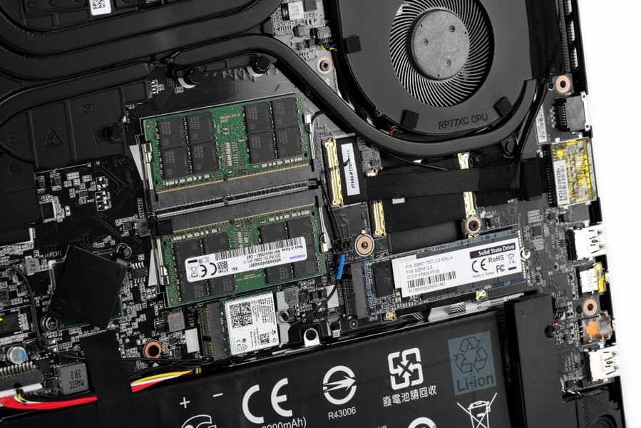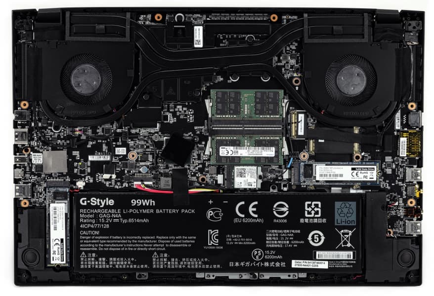 Оперативная память представлена двумя модулями SO-DIMM DDR4 объёмом 32 Гбайт каждый. Они могут функционировать как на частоте 3200 МГц, так и на частоте 2933 МГц. Рядом с модулями ОЗУ установлен модуль беспроводной связи Intel AX200NGW. Чуть правее нашлось место для одного из пары M.2 NVMe PCIe SSD-накопителей.