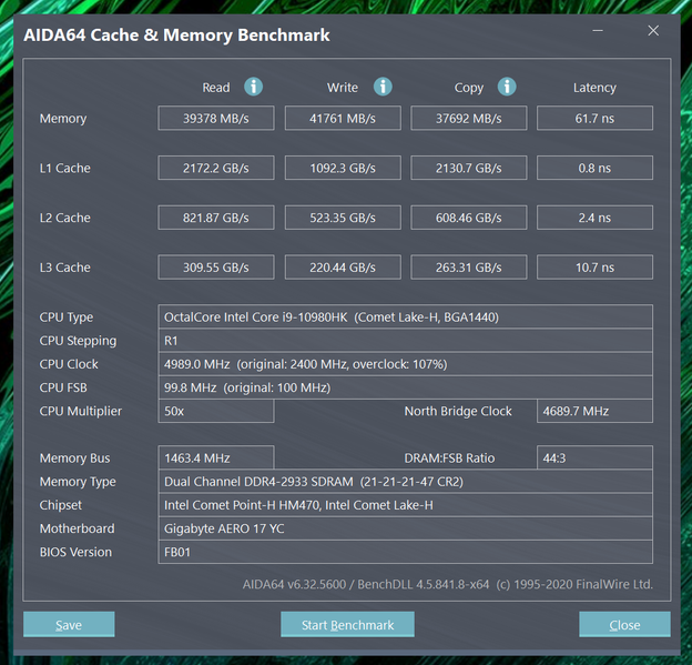 Модель Aero 17 HDR (RTX 30-серия), которую мы изучим сегодня, характерна процессором Intel Core i9-10980HK (2,4–5,3 ГГц), 64 Гбайт оперативной памяти с частотой 2933 МГц /3200 МГц, встроенным ГП GeForce RTX 3080 и парой твердотельных накопителей формата M.2 ёмкостью 1024 Гбайт каждый (NVMe PCIe Gen3, в RAID не объединены). Матрица 17,3" с разрешением 4K (3840x2160) обладает стандартной для работы частотой обновления 60 Гц для графического ядра Intel Ultra HD Graphics 630 в составе процессора, и 300 Гц – когда к обработке 3D-контента подключается ГП RTX 3080 (технология Nvidia Optimus), однако, ключевой особенностью дисплея является индивидуальная калибровка на заводе, после чего полученный профиль встраивается в ОС, а также функция HDR.