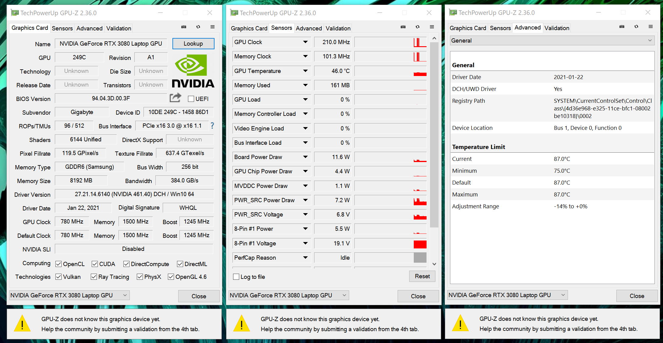 Так как подготовка материала была проведена до официального анонса, то утилита GPU-Z не смогла показать все параметры графического адаптера, но ключевые моменты указаны верно – это количество вычислительных ядер, их тактовая частота, объём и тип видеопамяти, как и её частота. Внутри установлен Max-Q вариант мобильной видеокарты RTX 3080 – память функционирует на эффективной частоте 12000 МГц.