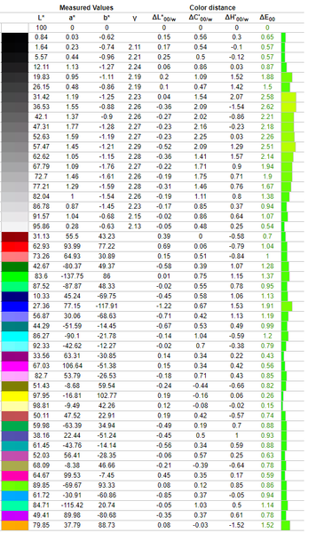Что касается обещанной заводской калибровки, то это можно полностью подтвердить. Хоть производитель и заявляет DeltaE <1, но с учётом погрешности измерений и разных устройств мы получили близкое к этому значение – 1,16 (максимальное – 2.62, но о нём речь не идет).