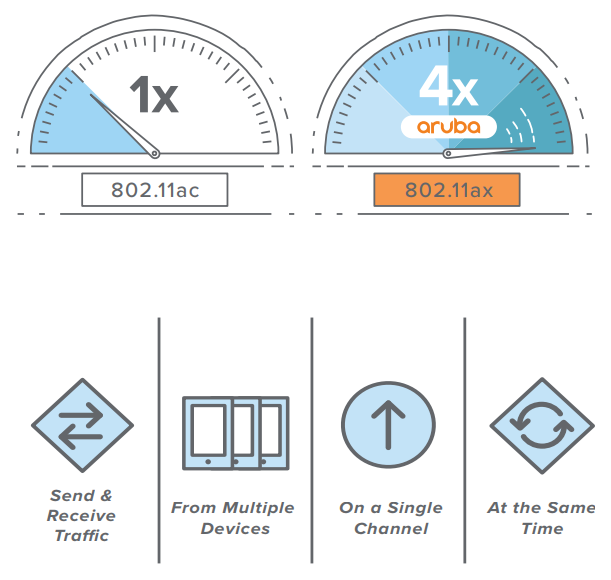 Серия Aruba 510 предназначена для одновременного обслуживания нескольких клиентов и разных типов трафика в плотных средах, повышая при этом общую производительность сети в 4 раза, по сравнению с точками доступа 802.11ac.