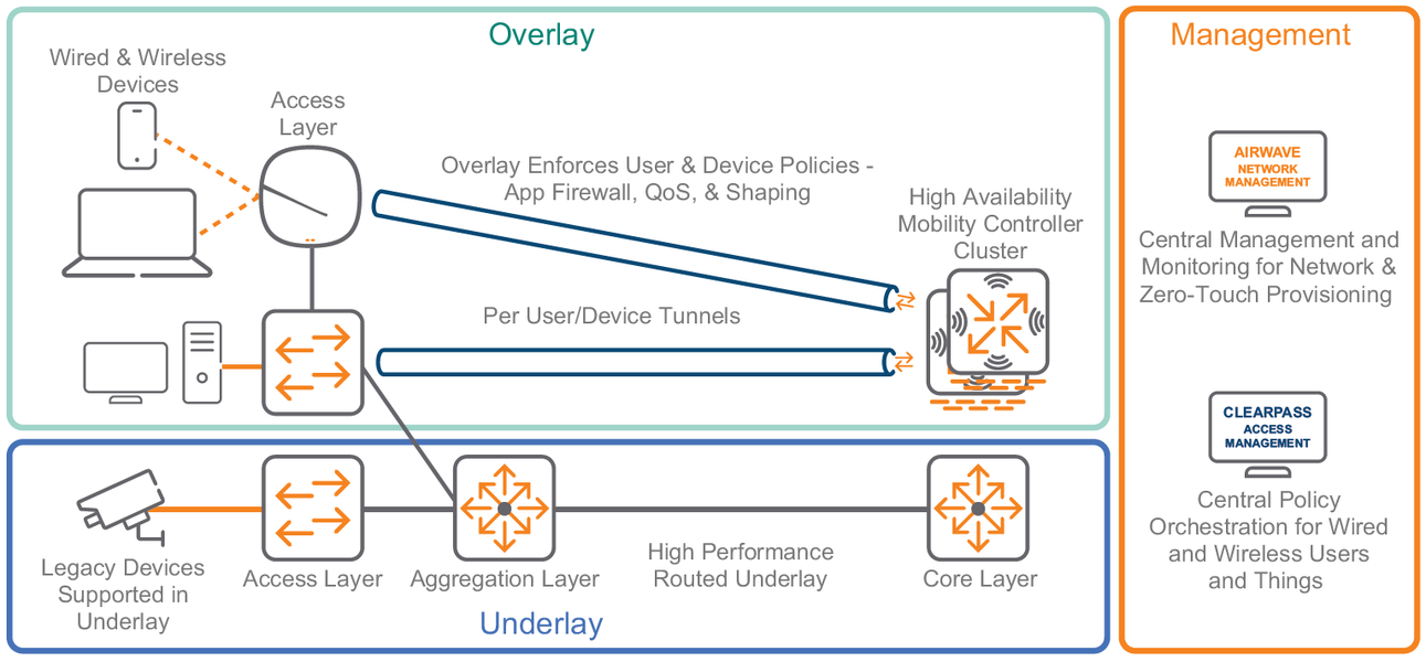 Наложенные сети позволят организациям безопасно туннелировать трафик уровня Layer2 и Layer3 поверх существующей сети. Решения от Aruba для беспроводных сетей с самого начала поставляются с наложенной моделью, позволяющей ИТ-специалистам предоставлять услуги, которые не были бы безопасными или стабильными в других сетях. Aruba распространяет эту функциональность и до проводных сетей, позволяя коммутатору уровня доступа действовать в качестве «проводной точки доступа». Таким образом, сетевой трафик от проводных и беспроводных пользователей и устройств направляется в централизованные кластеры контроллеров мобильности (Mobility controller). Все политики уровня пользователя и устройства, а также QoS и формирования трафика, могут быть применены на уровне наложенной (overlay) сети. Существующие структуры VLAN-ов и IP-адресов можно сохранить, т.к. политики применяются на уровне пользователей и групп, а VLAN-ы и IP-адреса не привязаны к политикам.