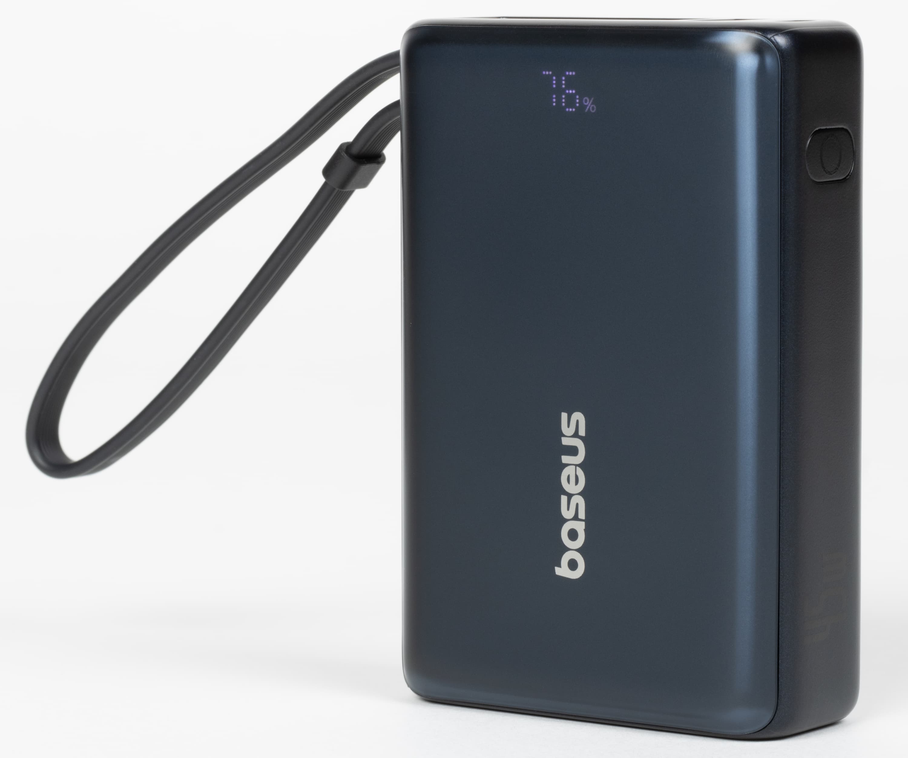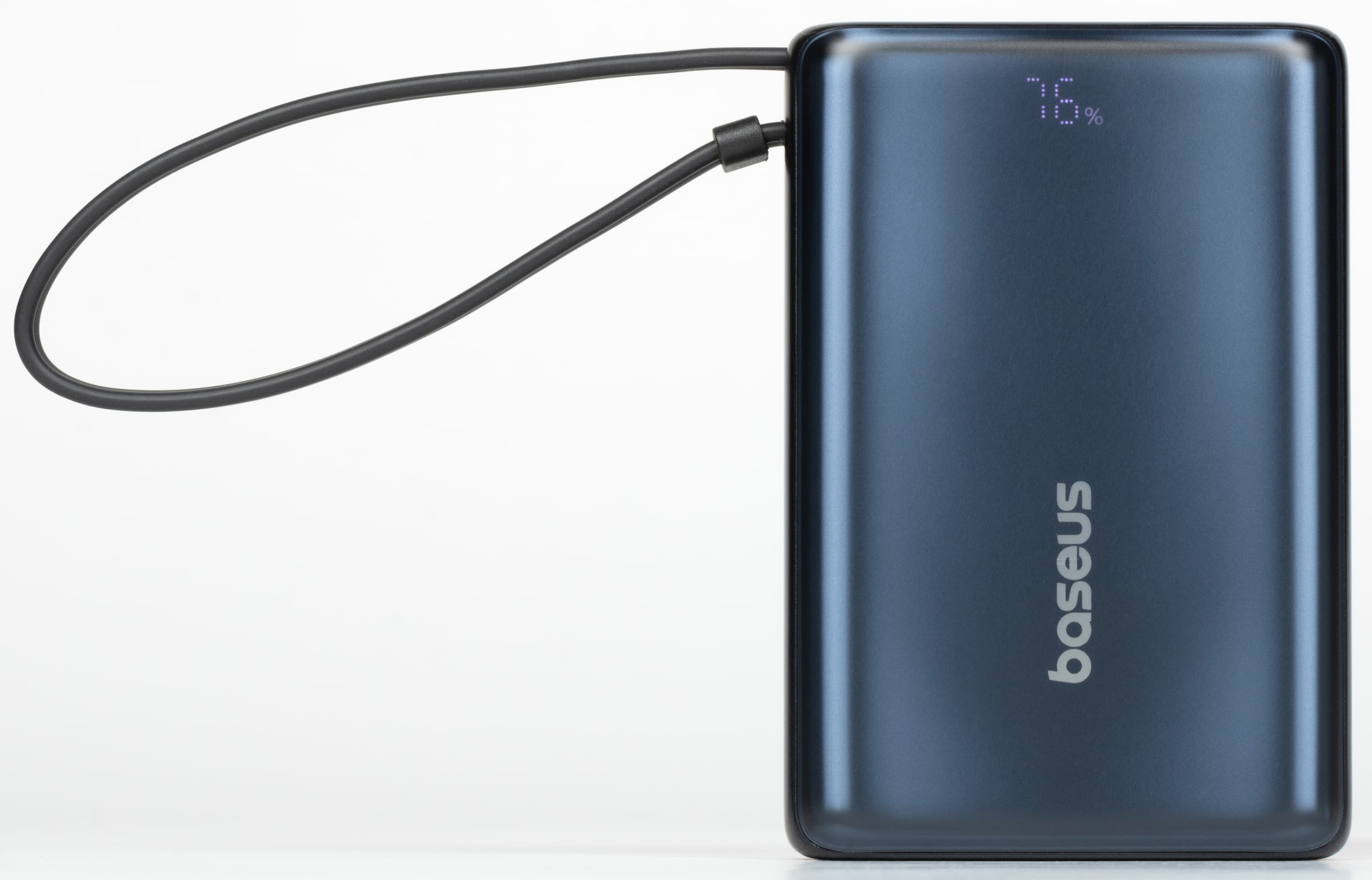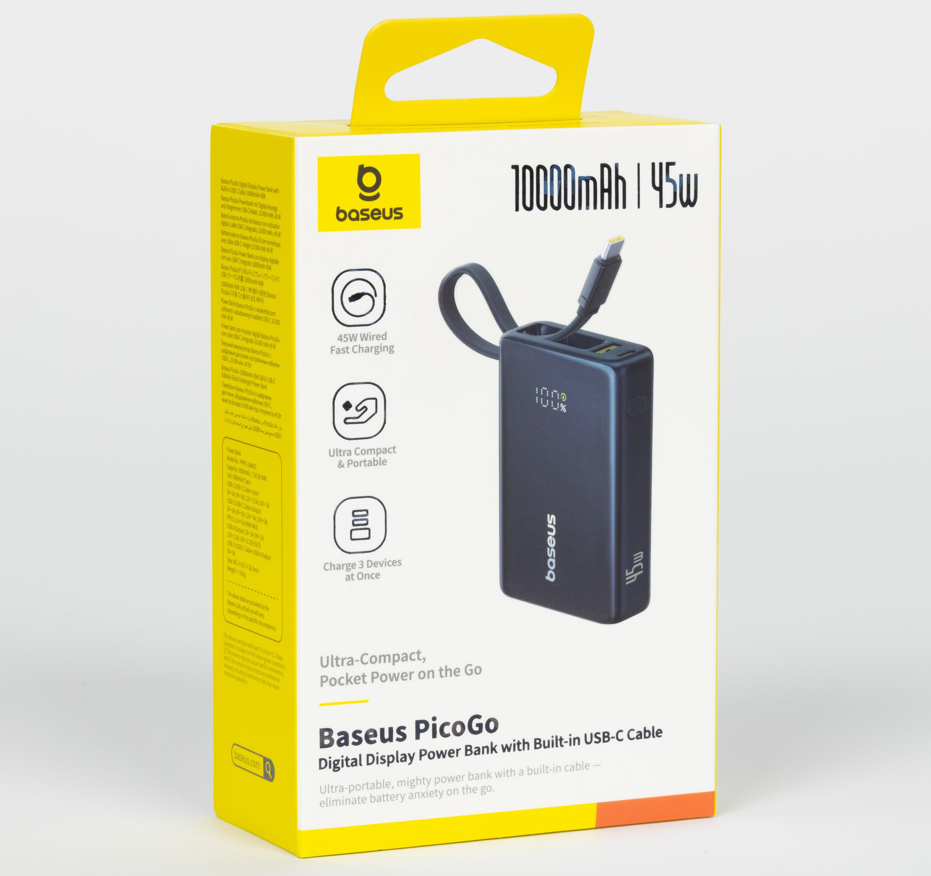 Модель Baseus PicoGo предназначена для питания мобильных устройств, потребляющих мощность до 45 Вт. Заявленная емкость батареи 10 000 мА·ч: 2 аккумулятора по 5 000 мА·ч с кремниево-углеродными ячейками (Silicon Carbon Anode Battery). По сравнению с традиционными литий-ионными они обеспечивают более высокую энергоёмкость. Пауэрбанк остаётся компактным по размерам, но способен выдерживать высокую нагрузку. Габариты и вес устройства позволяют носить его с собой каждый день, а подключать к нему можно до трёх нагрузок – к двум гнёздам USB-A и USB-C, а также к встроенному кабелю с коннектором USB-C (male).