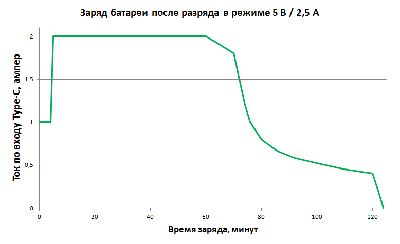 Время заряда — чуть больше 2 часов (124 минуты), при этом индикатор показал уровень в 100% через 1 час 40 минут, когда ток заряда ещё был существенный – на уровне 0,5 А.