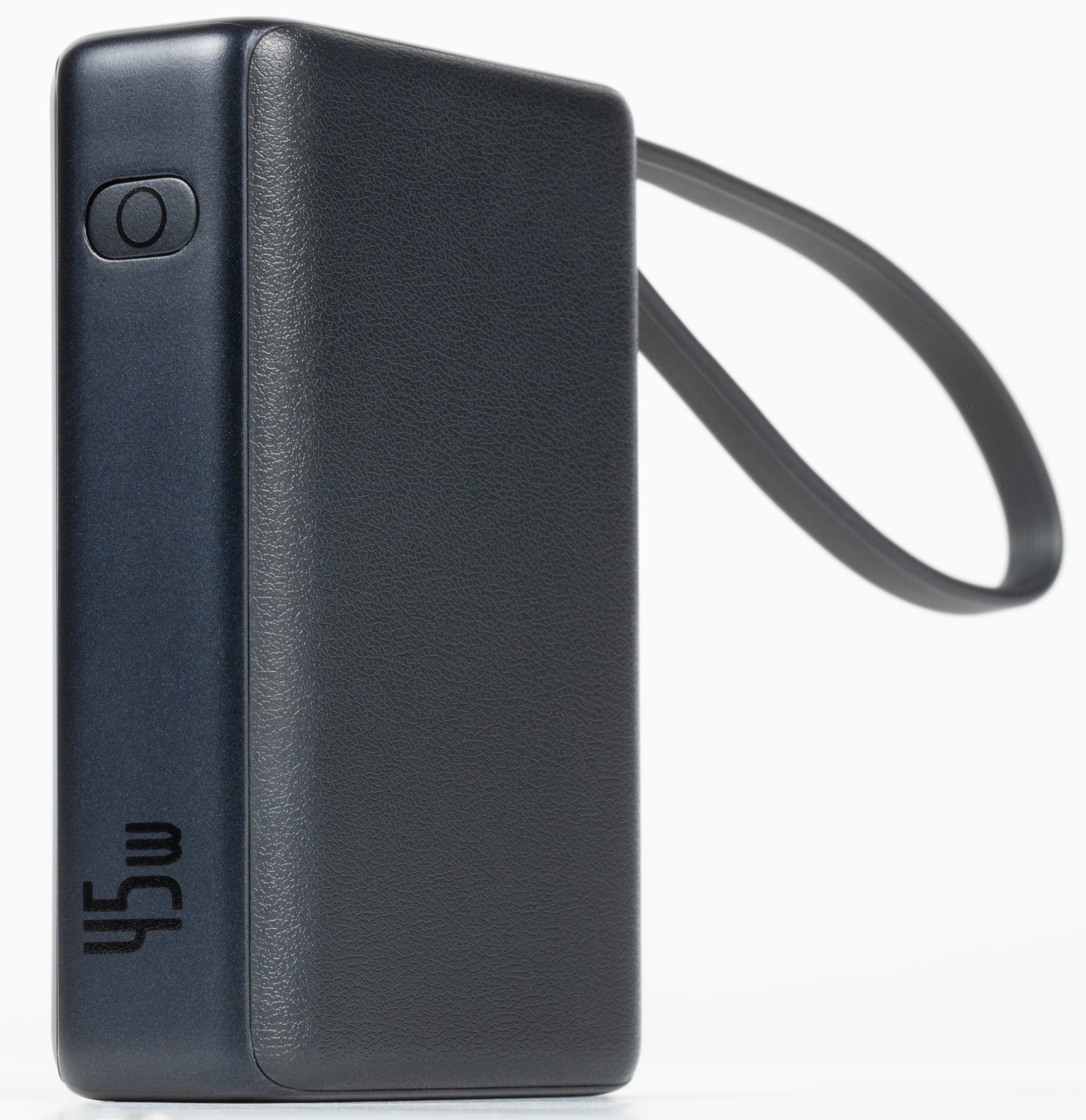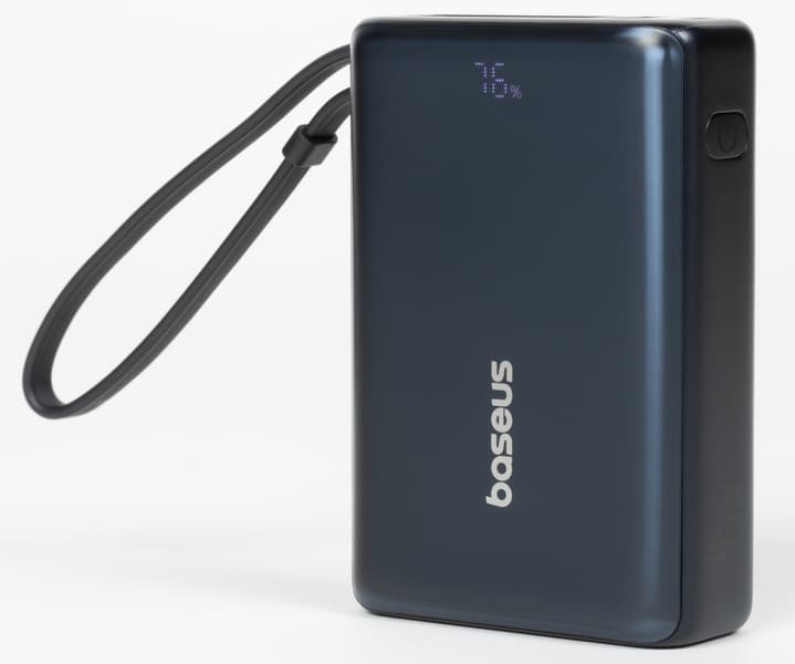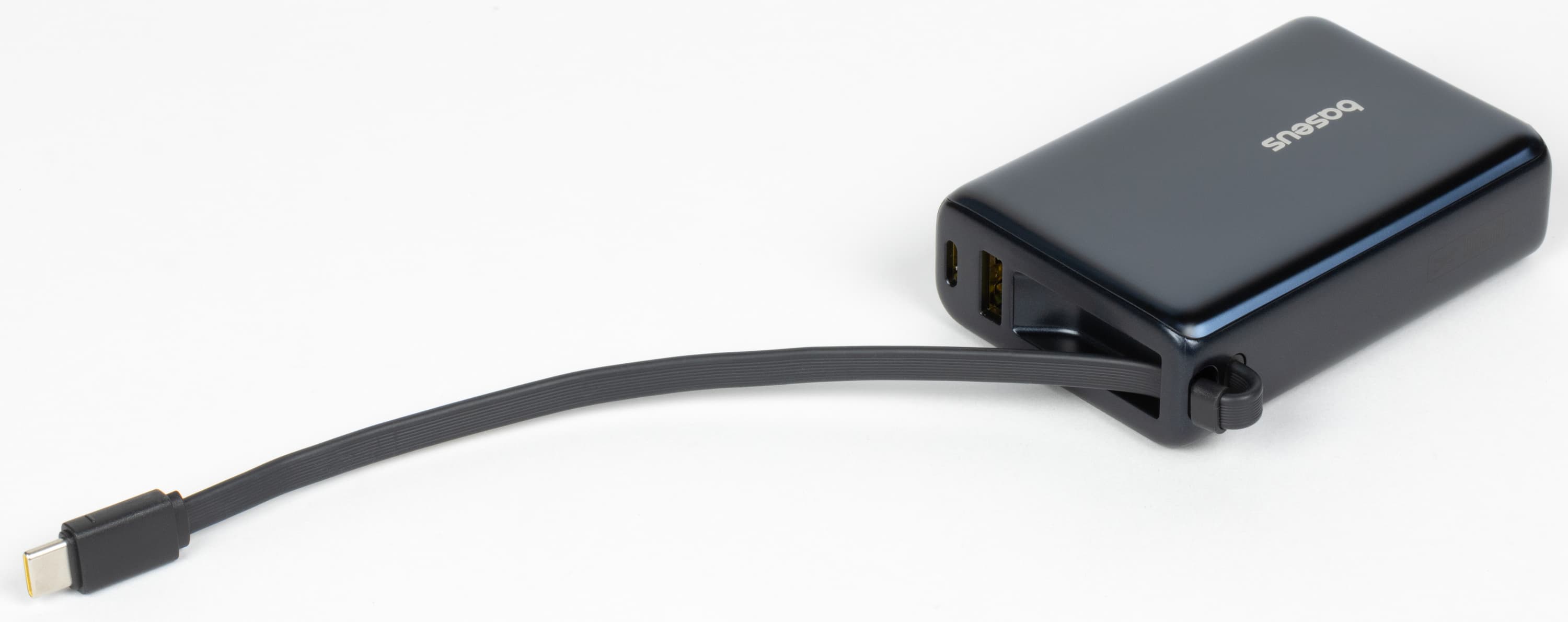 В конструкции есть оригинальная деталь: модель оснащена встроенным кабелем длиной 16 см, один конец которого распаян и закреплён внутри корпуса, а второй оснащён коннектором Type-C (male). Этот кабель не только может использоваться как для подключения нагрузок, так и для заряда батареи самого пауэрбанка, но также является петлёй, которая пригодится при переноске.