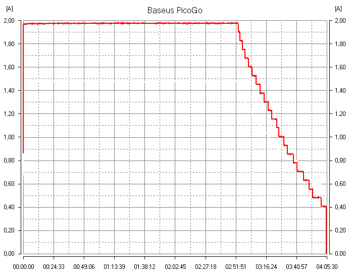 Для 5-вольтового режима спецификация говорит про максимум в 3 А, при токе 3,2 А пауэрбанк работает длительно (те же 10 минут), напряжение на разъёме 5,0 В. Защита срабатывает при 3,33–3,34 А через пару секунд.