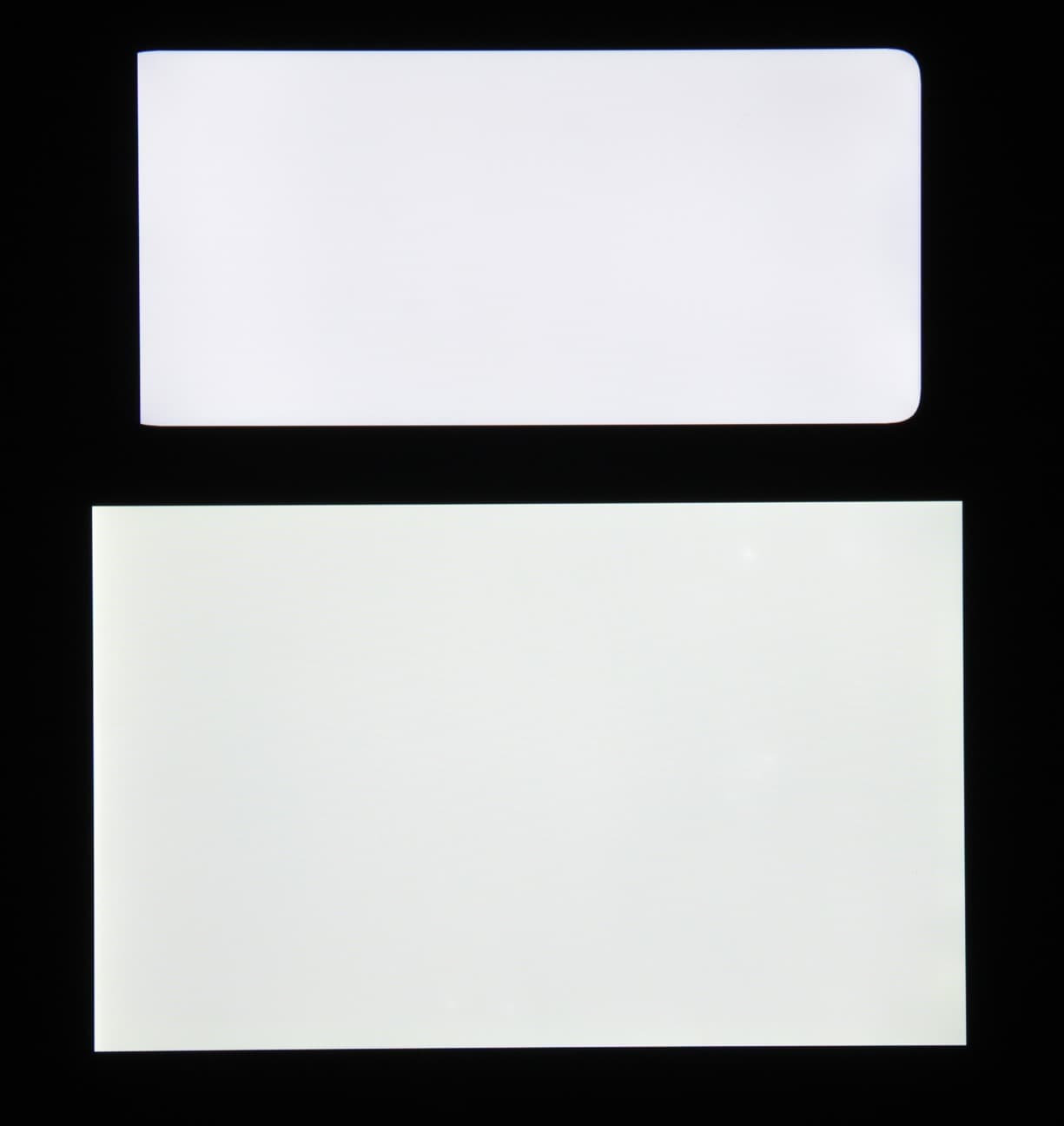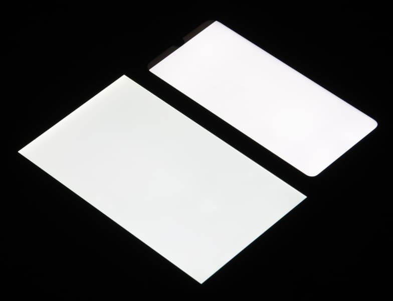 Черное поле при отклонении по диагонали сильно высветляется и приобретает красноватый оттенок. Фотографии ниже это демонстрируют (яркость белых участков в перпендикулярном плоскости экранов направлении одинаковая!):
