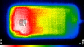 Нагрев больше в верхней части аппарата, что, видимо, соответствует расположению микросхемы SoC. По данным теплокамеры, максимальный нагрев составил 45 градусов (при температуре окружающего воздуха в 24 градуса), это существенно выше среднего значения для данного теста среди современных смартфонов.
