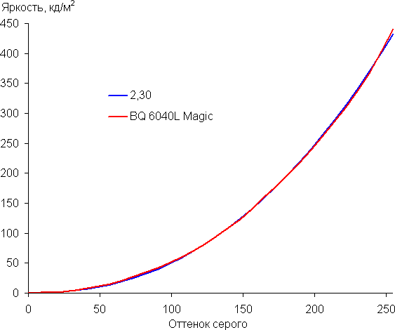 Контрастность (примерно в центре экрана) высокая — порядка 1000:1. Время отклика при переходе черный-белый-черный равно 24 мс (15 мс вкл. + 9 мс выкл.). Переход между полутонами серого 25% и 75% (по численному значению цвета) и обратно в сумме занимает 35 мс. Построенная по 32 точкам с равным интервалом по численному значению оттенка серого гамма-кривая не выявила завала ни в светах, ни в тенях. Показатель аппроксимирующей степенной функции равен 2,30, что немного выше стандартного значения 2,2. При этом реальная гамма-кривая чуть отклоняется от степенной зависимости: