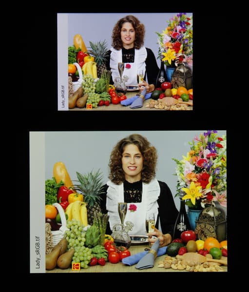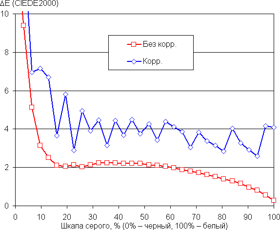 По умолчанию баланс оттенков на шкале компромиссный, так как цветовая температура существенно выше стандартных 6500 К, но отклонение от спектра абсолютно черного тела (ΔE) на большей части шкалы серого ниже 3, что даже для профессионального устройства считается отличным показателем. При этом цветовая температура и ΔE мало изменяются от оттенка к оттенку — это положительно сказывается на визуальной оценке цветового баланса. (Самые темные области шкалы серого можно не учитывать, так как там баланс цветов не имеет большого значения, да и погрешность измерений цветовых характеристик на низкой яркости большая.)