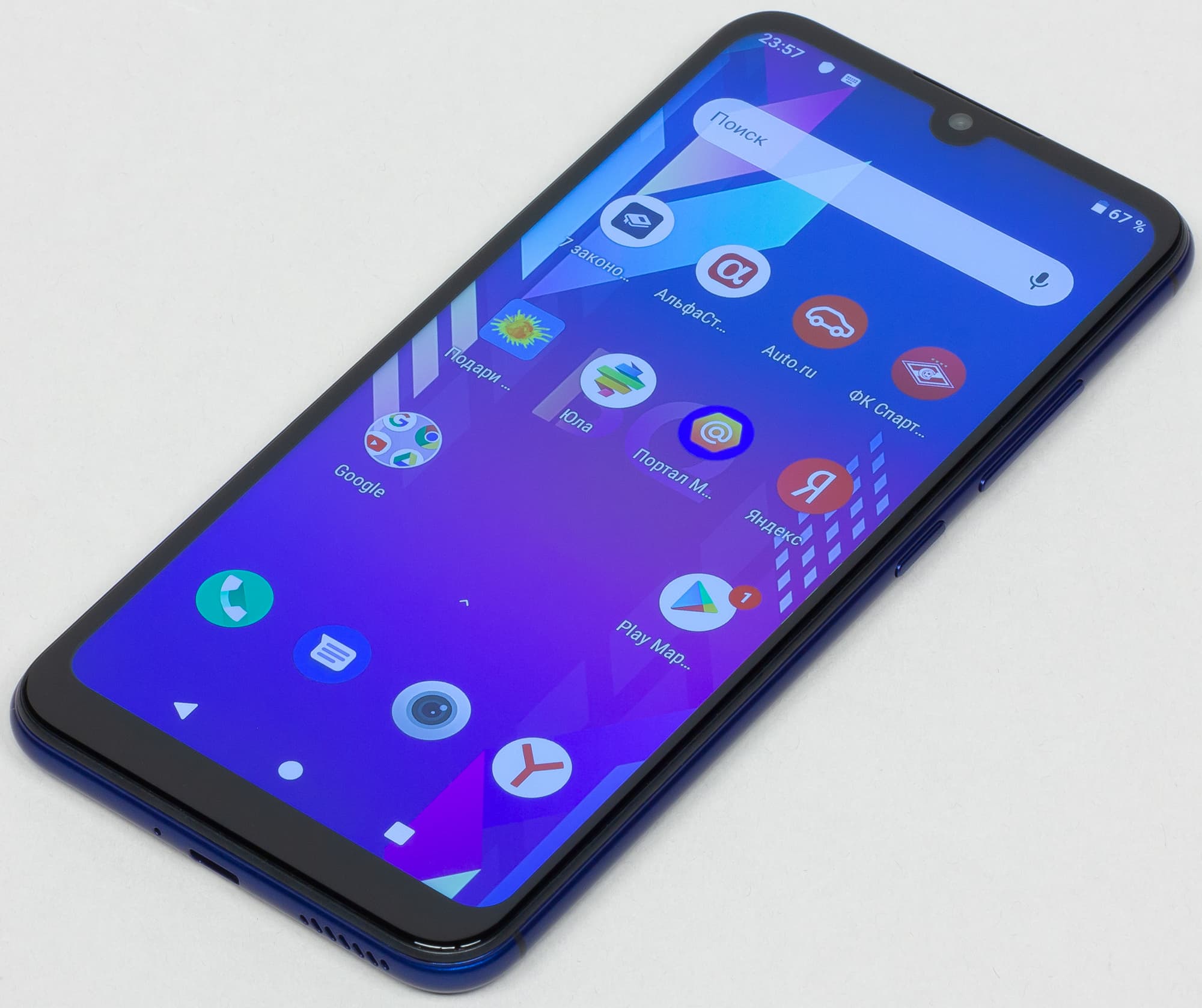 Экран с большой диагональю имеет современный каплевидный вырез под камеру, за счет чего рамки сузились до минимальных значений, а площадь экрана занимает около 90% всей передней поверхности. Соотношение сторон экрана составляет актуальные 19,5:9 (конечно же, без учета закруглений по углам).