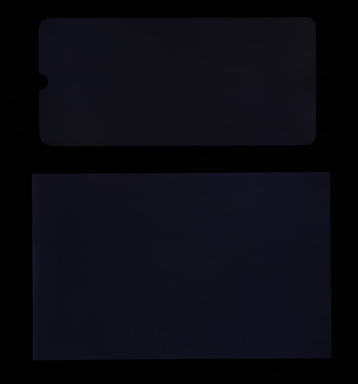 Лицевая поверхность экрана выполнена в виде стеклянной пластины с зеркально-гладкой поверхностью, устойчивой к появлению царапин. Судя по отражению объектов, антибликовые свойства экрана не хуже, чем у экрана Google Nexus 7 (2013) (далее просто Nexus 7). Для наглядности приведем фотографию, на которой в выключенных экранах отражается белая поверхность (слева — Nexus 7, справа — BQ 6040L Magic, далее их можно различать по размеру):