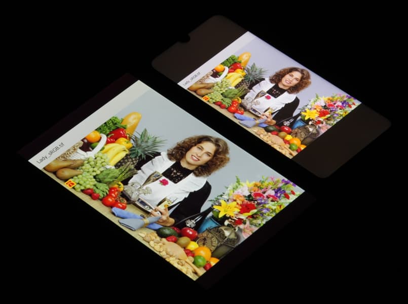 Экран имеет хорошие углы обзора без значительного сдвига цветов даже при больших отклонениях взгляда от перпендикуляра к экрану и без инвертирования оттенков. Для сравнения приведем фотографии, на которых на экраны BQ 6040L Magic и Nexus 7 выведены одинаковые изображения, при этом яркость экранов изначально установлена примерно на 200 кд/м², а цветовой баланс на фотоаппарате принудительно переключен на 6500 К.