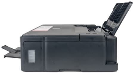 Сзади находится крышка подающего лотка, в рабочем положении откидывающаяся на угол около 45 градусов от вертикали. Приемный лоток горизонтальный, выдвижной, он расположен в нижней части передней панели. Таким образом, изгиб листа при проходе через механизм принтера относительно небольшой, что как раз и позволяет работать с носителями повышенной плотности, в том числе с бумагой для струйной фотопечати.