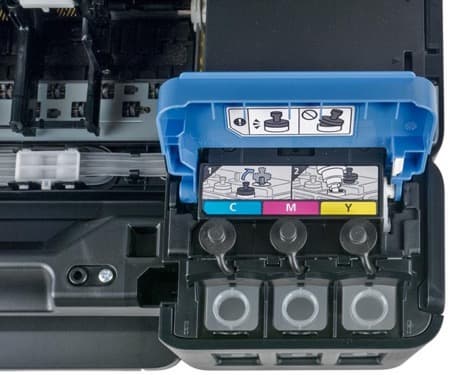 Ёмкости расположены двумя группами: слева одна большая для черных чернил, справа - три поменьше для цветных. Их горловины находятся под синими откидными крышечками и снабжены резиновыми пробками.