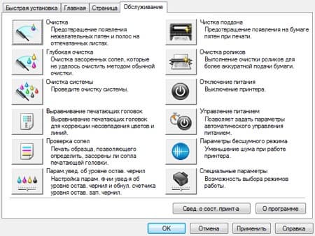 Там есть несколько пунктов, обязательных для любого струйного принтера: очистка и выравнивание печатающих головок, печать тестового образца для проверки работы сопел. Есть также два пункта, связанных с очисткой: подающих роликов и внутренних компонентов устройства (чистка поддона), вот только их использование в текущей версии руководства не поясняется.
