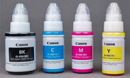 Официально к расходным материалам относятся бутылочки с чернилами (на сайте производителя они именуются чернильными контейнерами). Индекс у них один и тот же — GI490, но, естественно, с добавлением, уточняющим цвет: