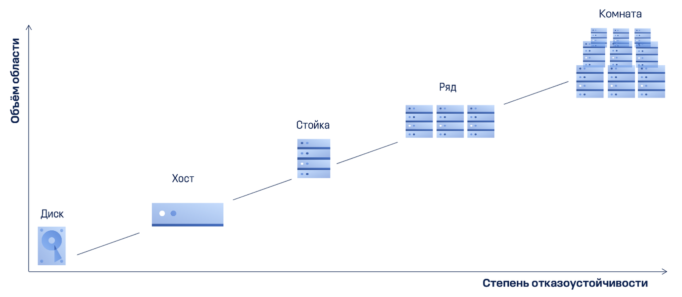 Высокая доступность системы обеспечивается за счет гибких настроек, среди которых можно выделить области отказа. Это те элементы системы, которые могут выйти из строя без потери данных и утраты системой работоспособности.