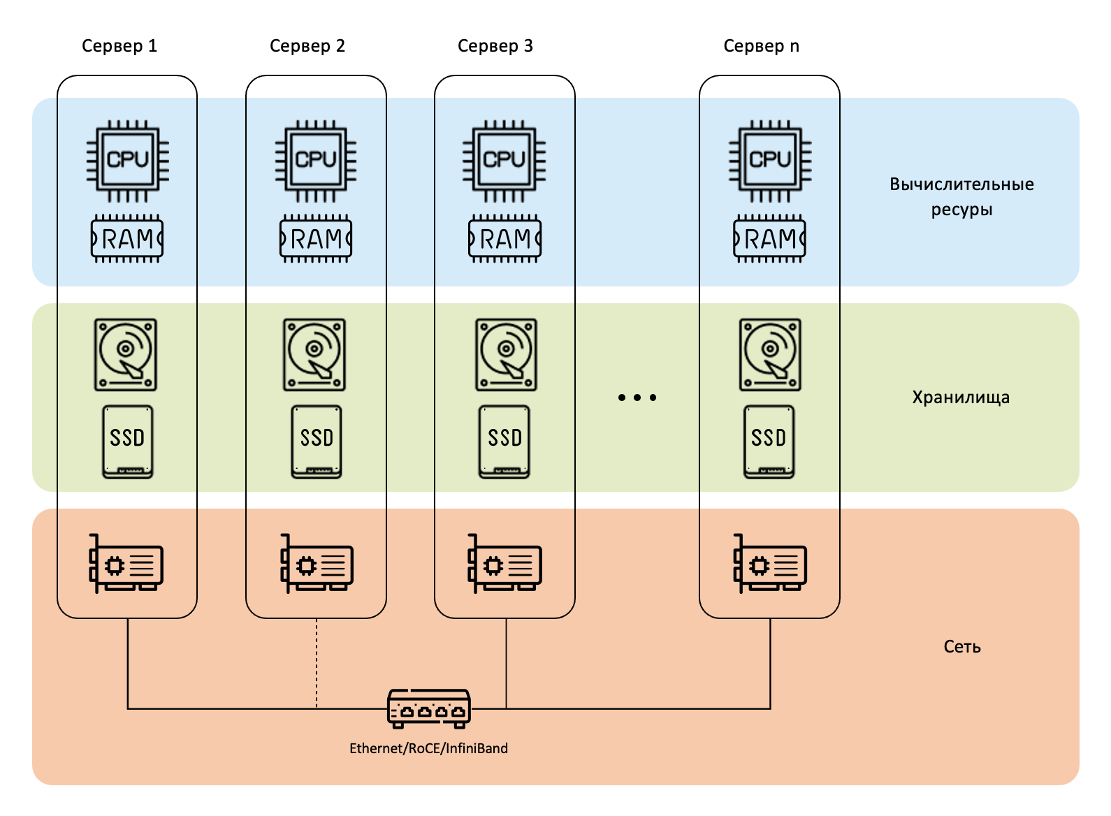 Гиперконвергентная инфраструктура – это инфраструктура, в которой вычислительные ресурсы серверов и устройств хранения данных объединены на программном уровне. При таком способе представления инфраструктуры в качестве аппаратной платформы используются только серверы стандартной архитектуры, что позволяет создать инфраструктуру любого масштаба для решения любых ИТ-задач.