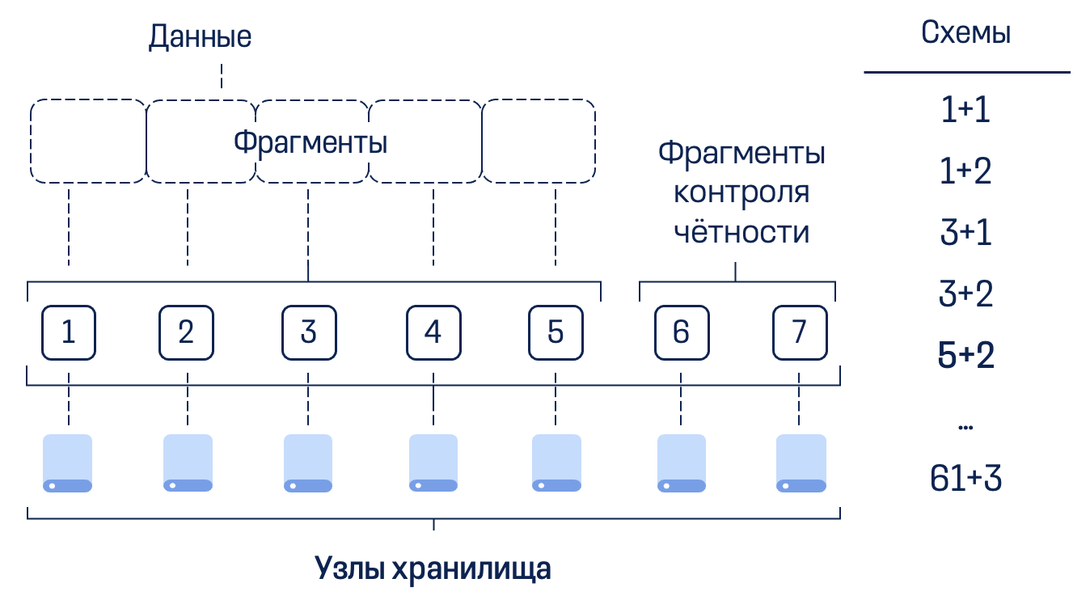 В продукте поддерживаются различные схемы избыточности. Чем больше число фрагментов, тем выше производительность и надежность в сценариях с большими нагрузками, например, при резервном копировании, хранении видеоархивов, документообороте и т. п.