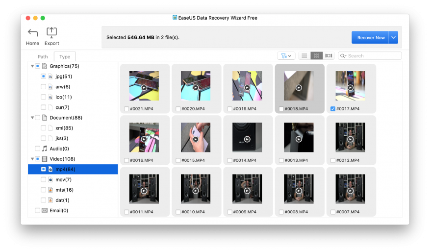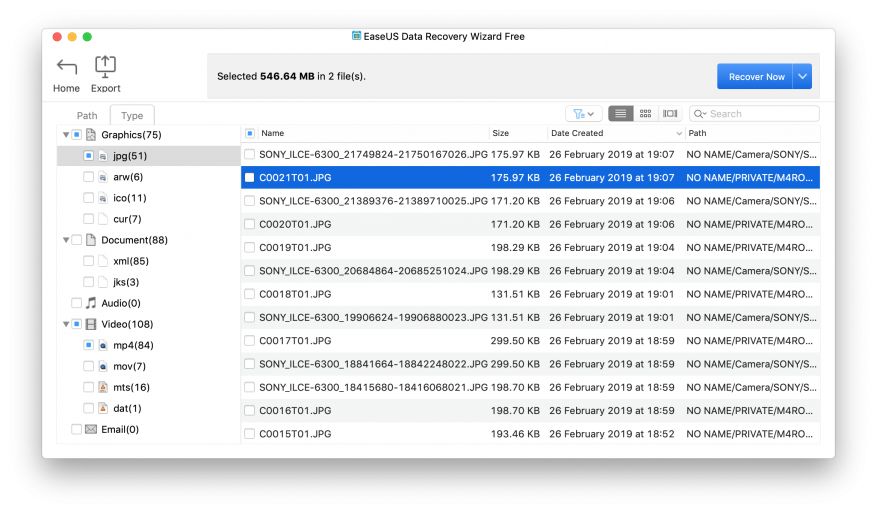 На экране с результатами есть два представления списка найденных файлов: в дереве папок или по типу контента (изображения, документы, видео и т. д.). Деревьев при этом несколько: похоже, в одни попадает то, что видно в файловой системе, в другие — то, что уже удалено. Да, почему-то среди результатов поиска на SD-карте показывались и стертые, и существующие файлы. По ходу дела выяснилось, что камера (Sony a6300) при съёмке видео делает фотографии-миниатюры, видимо, чтобы использовать их в своё интерфейсе показе списка видеороликов.