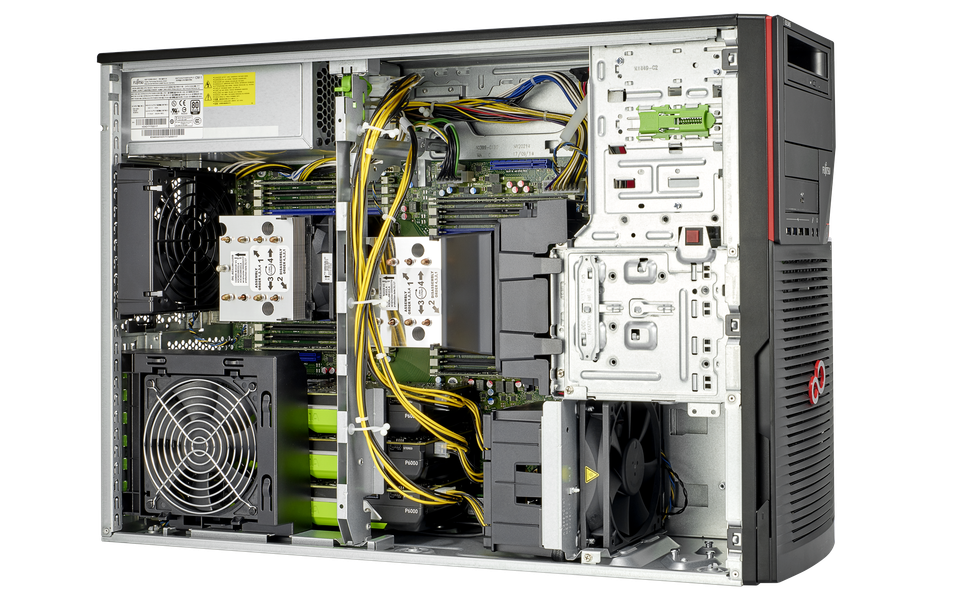 Fujitsu CELSIUS R970 — это в буквальном смысле персональный суперкомпьютер. Буква R в названии говорит о том, что это самое габаритное решение в линейке, в корпусе Big Tower объемом 49 литров. Такой размер позволяет разместить в корпусе до двух процессоров Intel Xeon и соответствующую систему охлаждения, до терабайта (!) оперативной памяти и до трех графических карт. При этом рабочая станция производит крайне мало шума — при умеренных нагрузках система работает тише шепота или пения птиц (23 дБ).