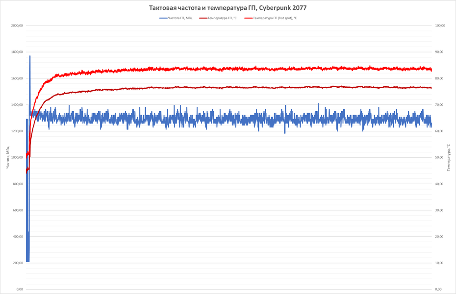Температура графического процессора в играх в устоявшемся режиме составляет около 76-78 градусов (hotspot – в районе 84 градусов), а его тактовая частота колеблется в районе 1200 - 1400 МГц в зависимости от нагрузки.