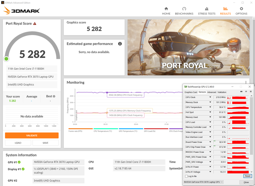 Производительность в некоторых тестах мы представим в двух режимах – при подключённом внешнем блоке питания и при работе от батареи. В бенчмарке 3DMark Port Royal результат практически подобрался к отметке 5300 баллов. Частота графического процессора колеблется в районе 1450 МГц, его энергопотребление ограничено отметкой 67 Вт (энергопотребление видеоподсистемы в целом - до 92 Вт), а частота процессора при необходимости превышает отметку 4.5 ГГц.